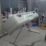 一番大きな窓をコーキングを入れて取り付けます 次は丸窓の取付です 外装のアルミ板と内装の合板を寸法を合わせて丸く切り抜きます こちらもコーキングを入れて取り付けます